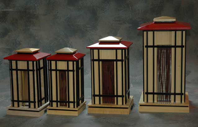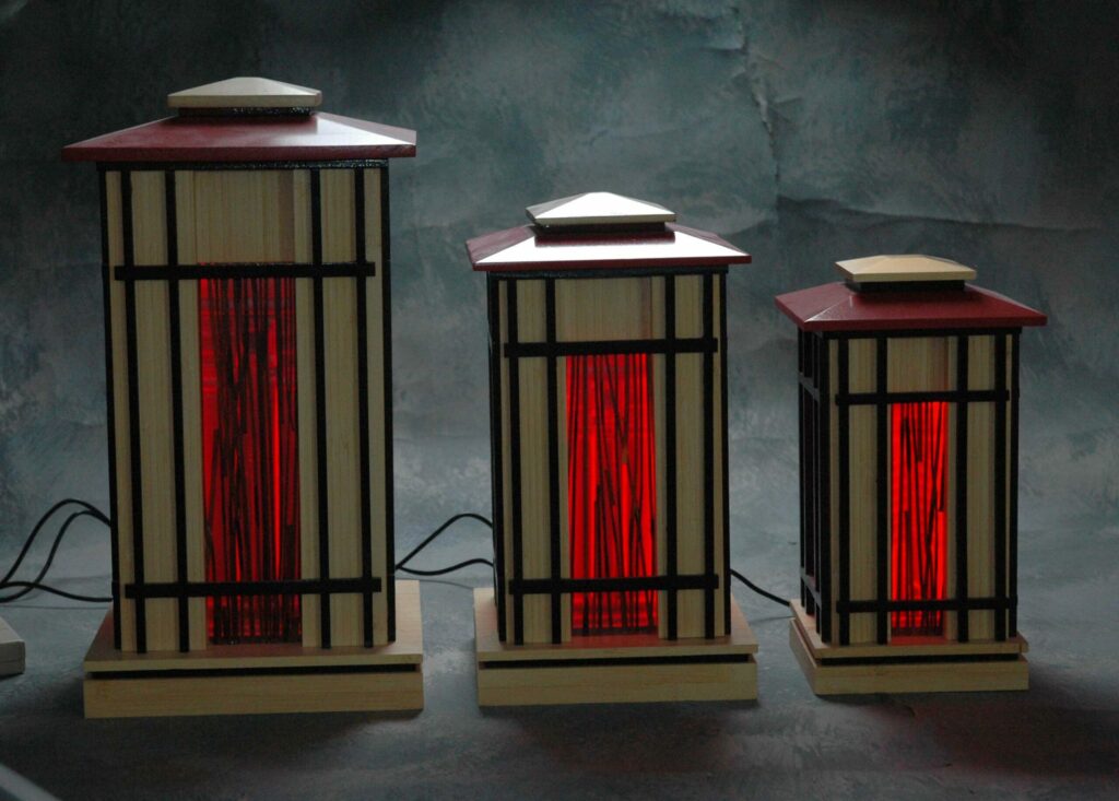 The two art pieces I have are a lovely way to faintly light a dark corner of my bedroom and living room. The two way switch for softly lit or slightly brighter is appreciated. The look of the glass is in the classic Prairie design. I have the ashes of my husband in the ceramic of the larger wooden Prairie vessel. I also love the small flocked box for holding memorabilia.