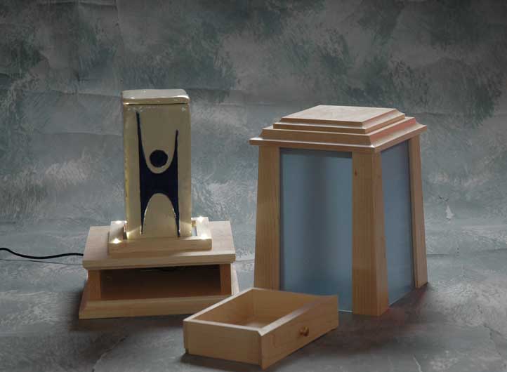 Expertly crafted in maple, Modern Lights are 8″ x 8″ x 12″ and feature energy-efficient, everlasting, white LED lights and a two-way switch allowing for light level adjustment. Each light comes with a beautifully designed ceramic vessel insert and a bottom drawer for storage. The bottom brass plate can be engraved for customization or dedication. Available in two acrylic style options.