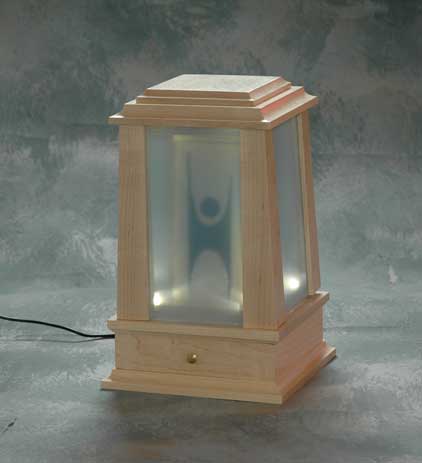 Expertly crafted in maple, Modern Lights are 8″ x 8″ x 12″ and feature energy-efficient, everlasting, white LED lights and a two-way switch allowing for light level adjustment. Each light comes with a beautifully designed ceramic vessel insert and a bottom drawer for storage. The bottom brass plate can be engraved for customization or dedication. Available in two acrylic style options.