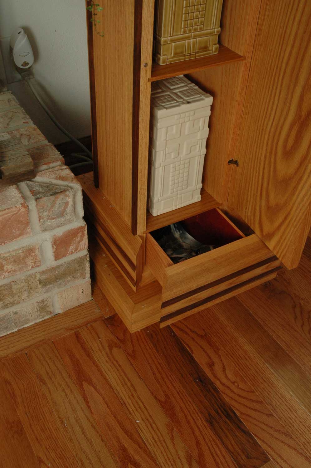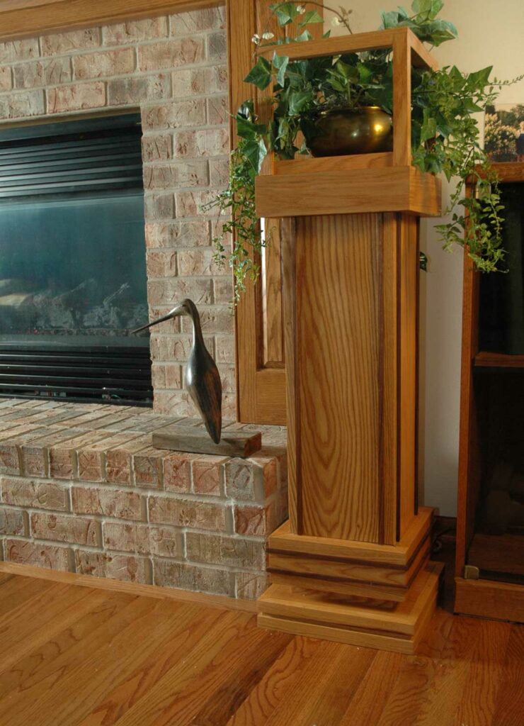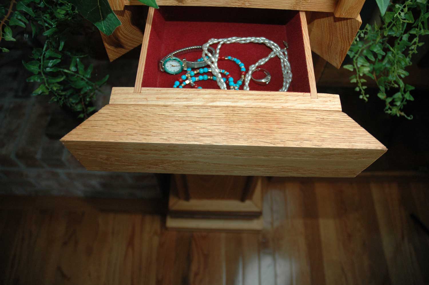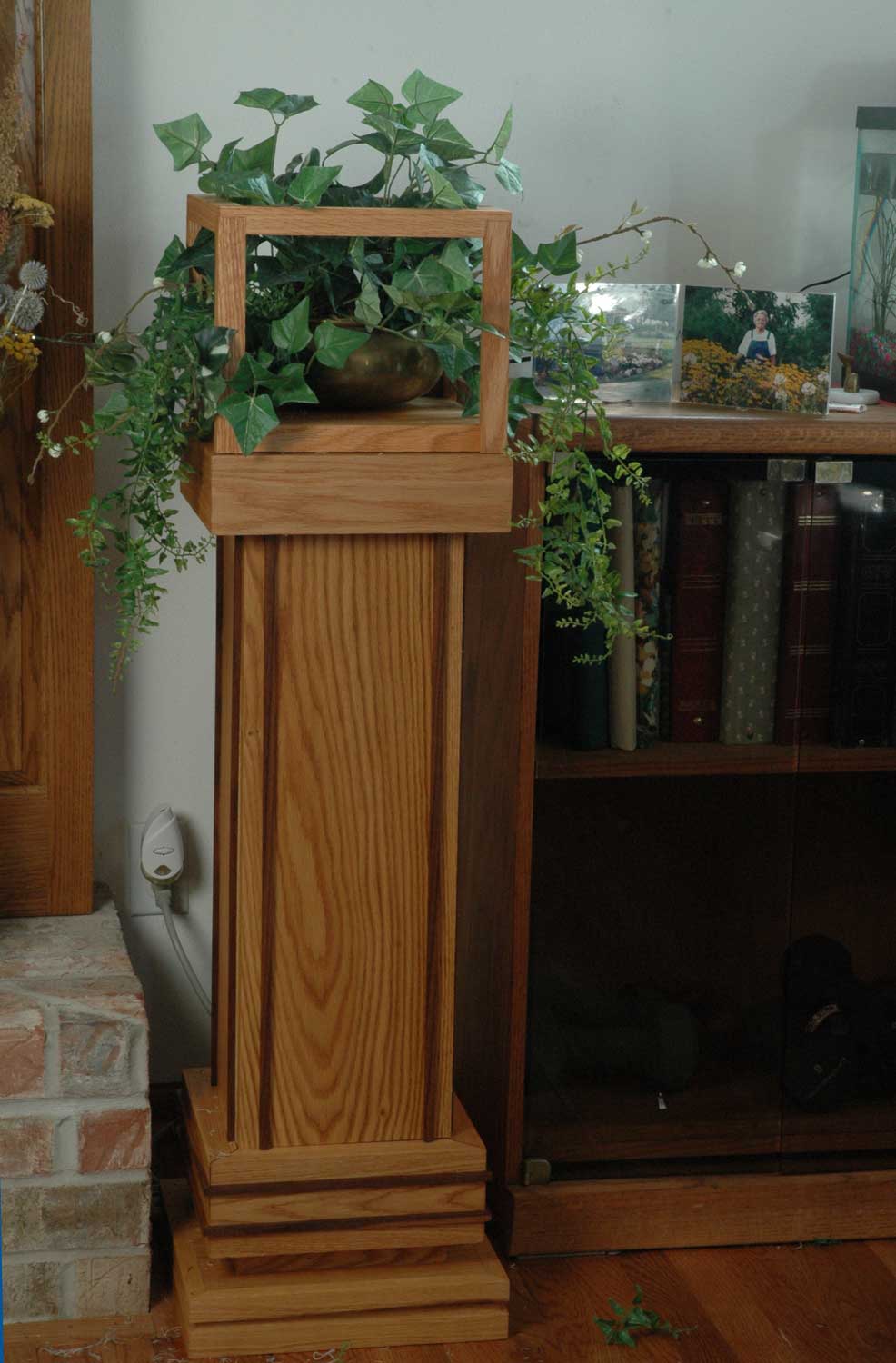 The Prairie Pedestal is crafted in oak with walnut accents. Two coats of Danish oil provide the gently lustrous finish. The horizontal flat top platform allows for a plant or vase of freshly cut flowers. Immediately below the platform is a hidden flocked drawer to put small items of value or what have you. SURPRISE!, there are TWO hidden flocked drawers, the second is near the bottom of the pedestal, both have a inside size of 6 1/2″ x 6 1/2″ x 2 1/2″ deep. AND one more surprise: a hidden cavity of space 25″ tall (covered by the outer wood that doubles as a door). The inside space is divided by a horizontal shelf. Inside measurements are 7″ wide and deep. What can you do with your space? It’s up to you, my largest ceramics fit in each half of this space. I think its a striking piece with hidden intrigue.