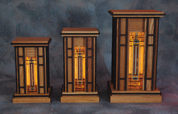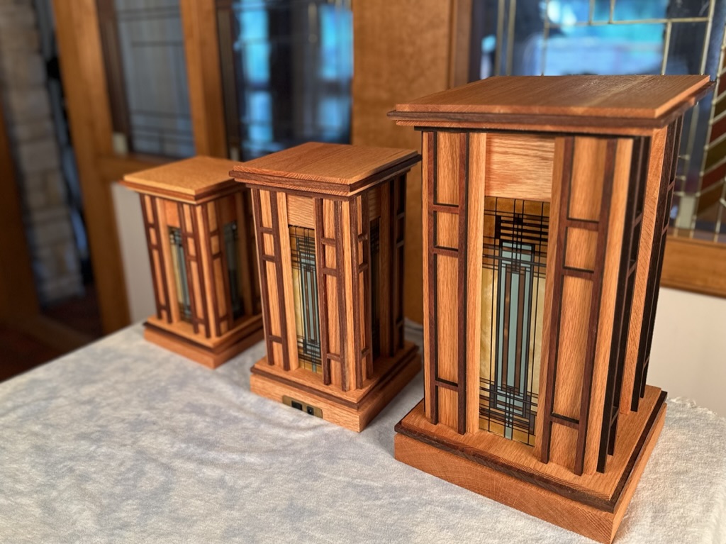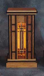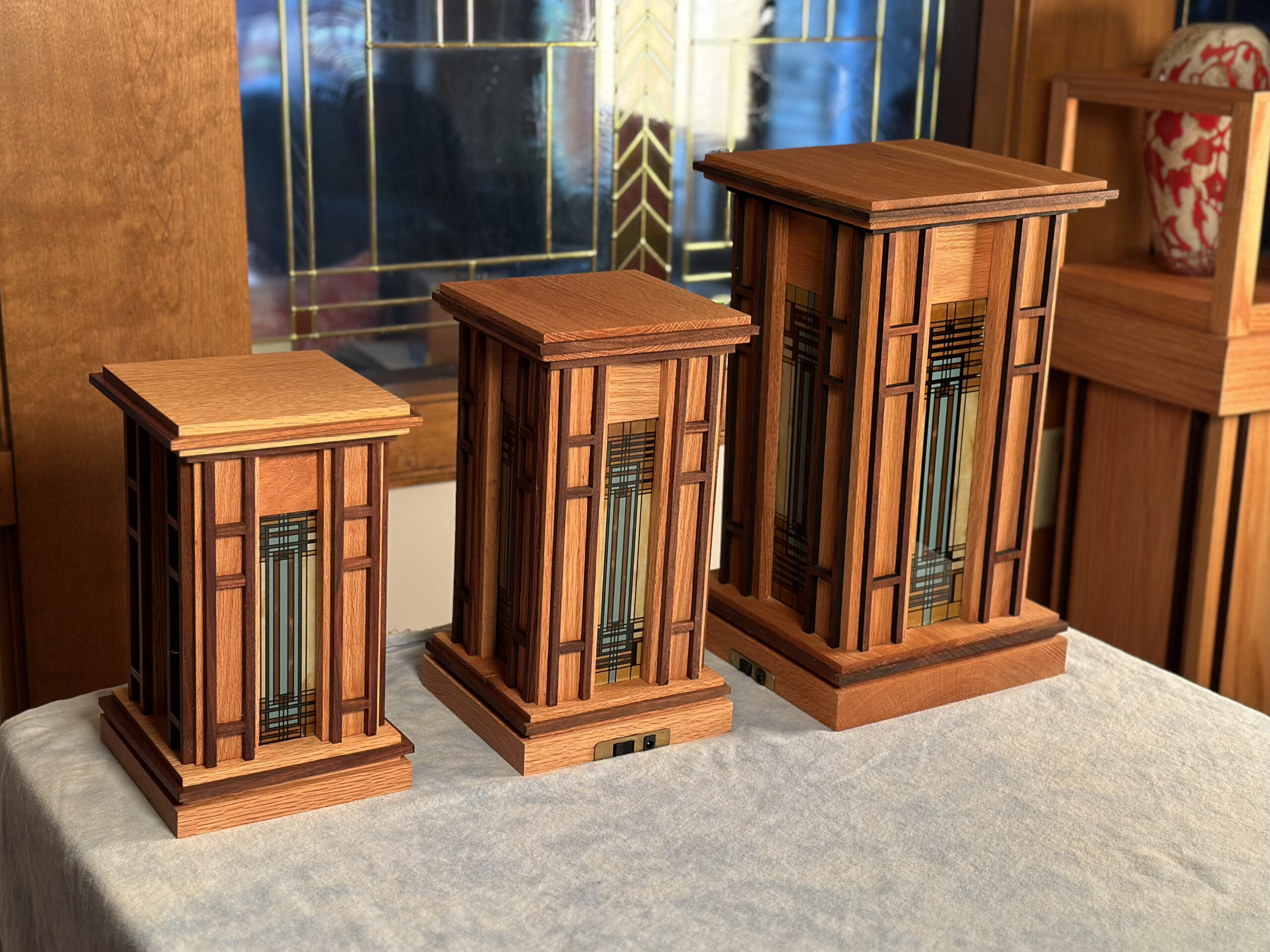 The two art pieces I have are a lovely way to faintly light a dark corner of my bedroom and living room. The two way switch for softly lit or slightly brighter is appreciated. The look of the glass is in the classic Prairie design. I have the ashes of my husband in the ceramic of the larger wooden Prairie vessel. I also love the small flocked box for holding memorabilia.